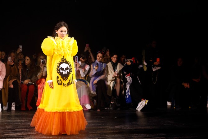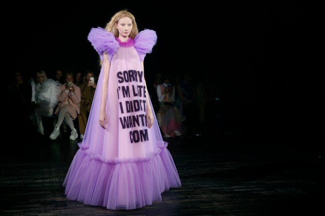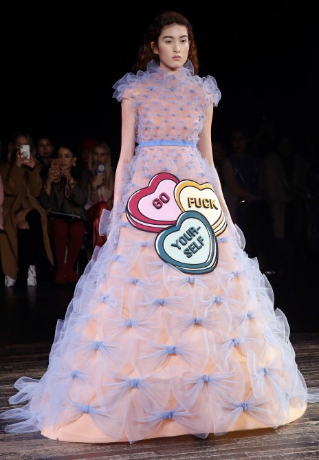 In addition to the JOMO vibe, the couture line offers looks for those who really just want to be left alone. Phrases like “Go to hell”, “Go fuck yourself” and, my personal fave, “I’m not shy. I just don’t like you” grace the fronts of these Viktor & Rolf dresses. It’s basically my (and every other introverted, very online millennial’s) dream come true.