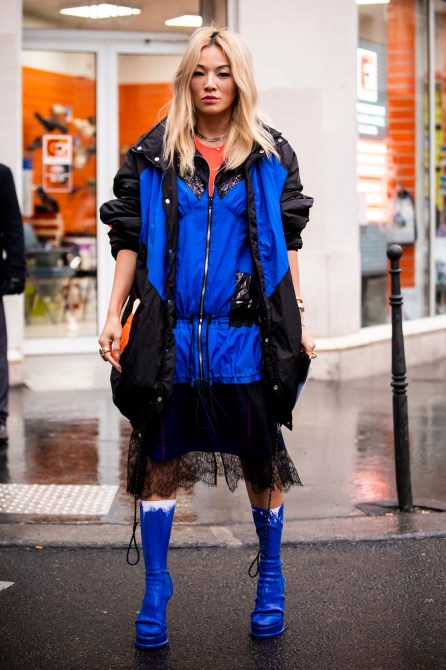 Social media influencer Tina Leung, wearing an orange top, black and blue long jacket, blue socks and blue heels, is seen outside Maison Margiela show.