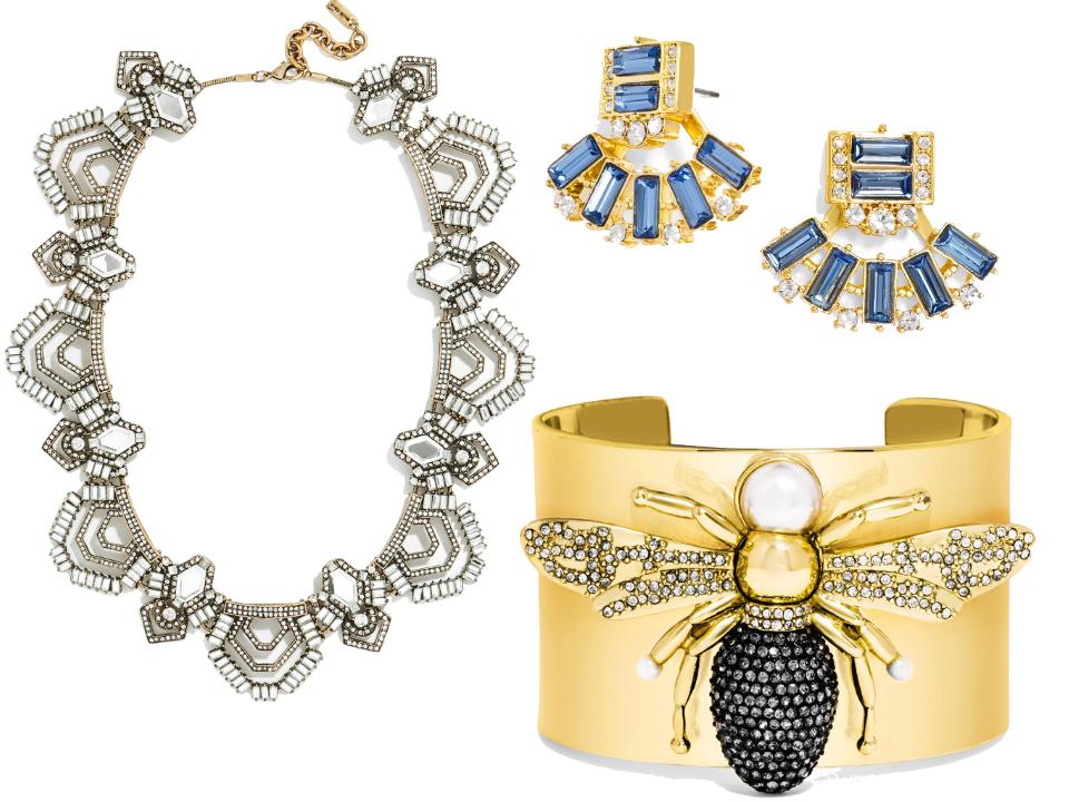 The bulk of the collection is comprised of collar necklaces dripping with crystal quartz ($68), oversize insects ($48–$68) and mirrored gold ($48), plus a handful of chunky, sculptural cuffs ($38–$58). Make no mistake, these items are designed to make a statement.