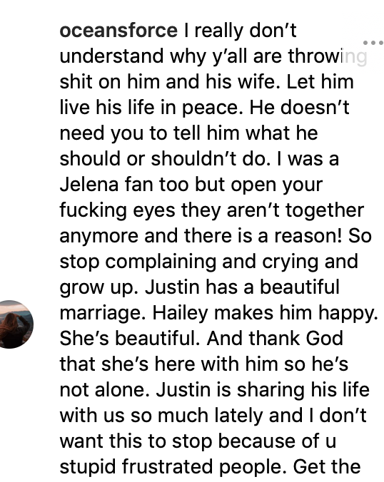 Many fans came to Bieber’s defense, reiterating how unnecessary it was for haters to hate. One commented, “I really don’t understand why y’all are throwing shit on him and his wife. Let him live his life in peace. He doesn’t need you to tell him what he should or shouldn’t do. I was a Jelena fan too but open your fucking eyes they aren’t together anymore and there is a reason! So stop complaining and crying and grow up. Justin has a beautiful marriage. Hailey makes him happy. She’s beautiful. And thank God that she’s here with him so he’s not alone. Justin is sharing his life with us so much lately and I don’t want this to stop because of u stupid frustrated people. Get the fuck out of his Instagram if you don’t like him with Hailey because that’s his life right now and for a long time! Damn.”